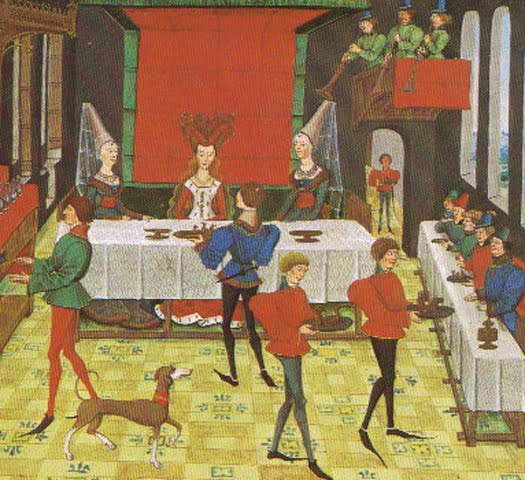 Note that there are no greyhounds in the kennel. Greyhounds were favored above all other breeds and had the run of the castles. This may also explain how the lines of greyhounds were kept pure by the nobility. The second plate is from Tres Riches Heures of Jean, Duke of Berry (1340-1416), now in the Musee Conde. The Duke is the man in blue with the brown hat. The wedding scene in the third plate,from the Histoire de Renaud de Montauban, dates from about 1470 and shows a greyhound, or conceivably a Saluki, since part of the Renaud romance involves a crusade. Other dogs might be kept by hunting staff in their quarters in the castle, but would probably not have had the same freedom as greyhounds. For pictures of collars worn by greyhounds from late medieval times onward, see the website of the Leeds Castle Dog Collar Museum. Greyhounds may have been separated from other dogs not just for their comfort but to keep the lines pure. Phoebus gives a recipe for aborting an unwanted litter. A sort of canine chastity belt was known even in the ancient world (Anderson, p. 46).
